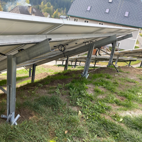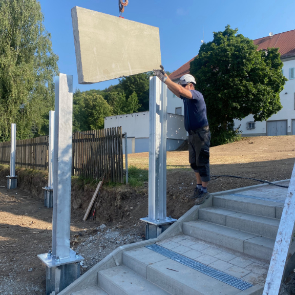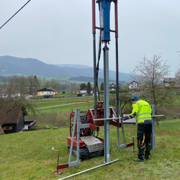 Der Zugang zu unserer Baustelle war aufgrund der baulichen Situation recht beengt, dennoch passte die Raupe mit Ramme durch eine 90cm breite Türe. Das Einschlagen der Fundamente mit Längen zwischen 100cm und 170cm ging sehr rasch vonstatten, die Hanglage stellte für die Maschine kein Problem dar. Die Fundamente wurden punktgenau gesetzt, befinden sich in der Waage und machen einen sehr stabilen Eindruck. Bereits nach ca. zwei Stunden war alles erledigt. Auch die von uns beigestellten Pfostenträger wurden mit den Fundamentplatten verschraubt.
