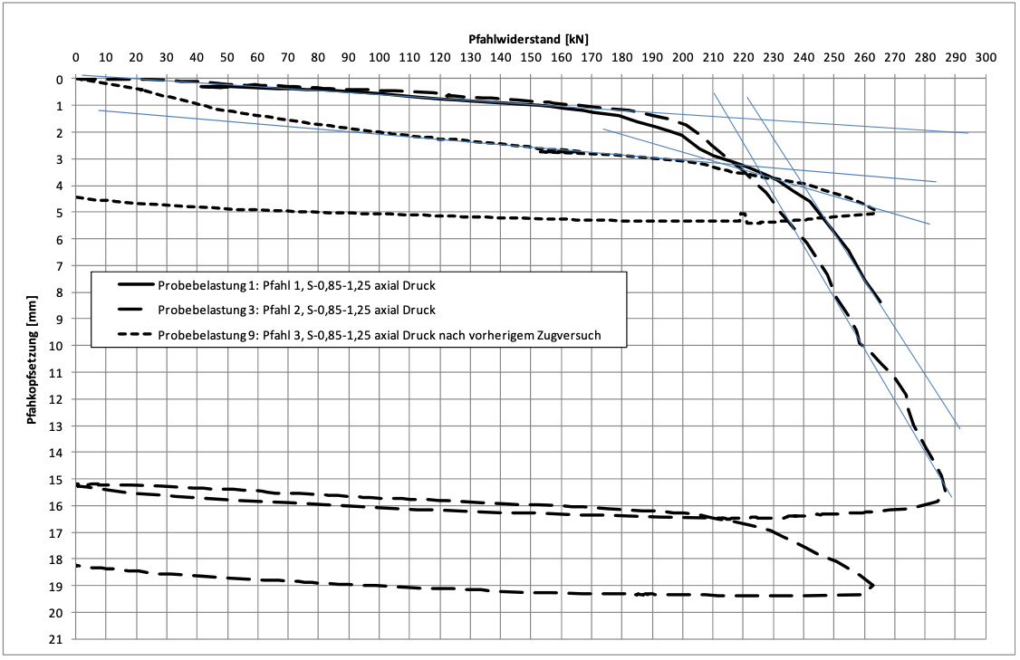 Widerstand-Setzungs-Linie für den Pfahltyp S-0,85-1,25 bei axialer Druckbeanspruchung 2 Beispiele unserer Prüfergebnisse